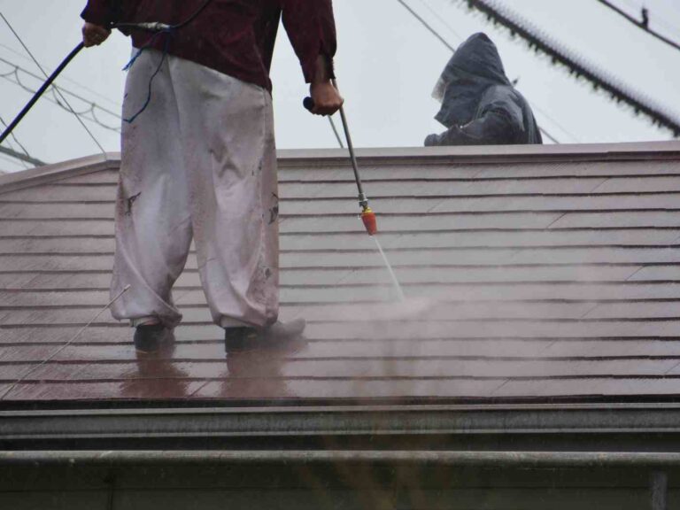 We pressure wash, remove moss, treat rust, and prime each surface before any coating is applied.